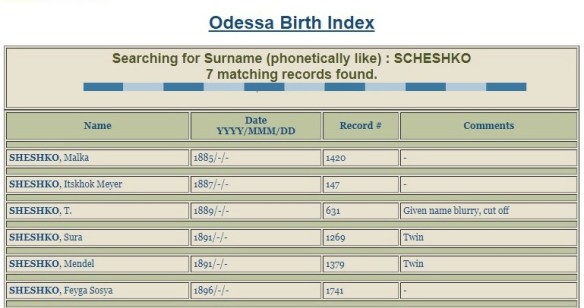 Look at that! Malka and Itskhok Meyer (just another spelling!), born in the right decade. But in the right city? The gardener had been told they came from Tiraspol, which is in Moldova. This database is for babies born in Odessa, which is in Ukraine. How can they be the same then? Maybe Scheshko was more common than we thought.