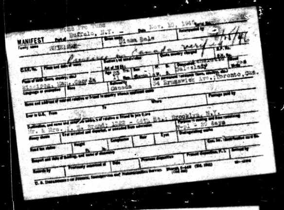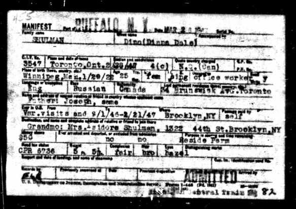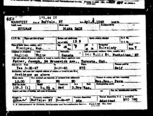 At one point, Diana seemed to be indicating at the border that she would live with her grandmother, Mrs. Isidore Shulman, who appeared to live with the Brands (one of Diana’s grandmother’s daughters) during the mid-forties.
