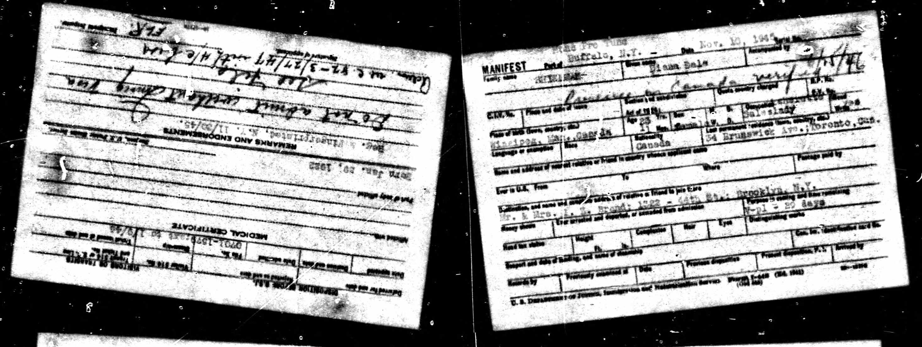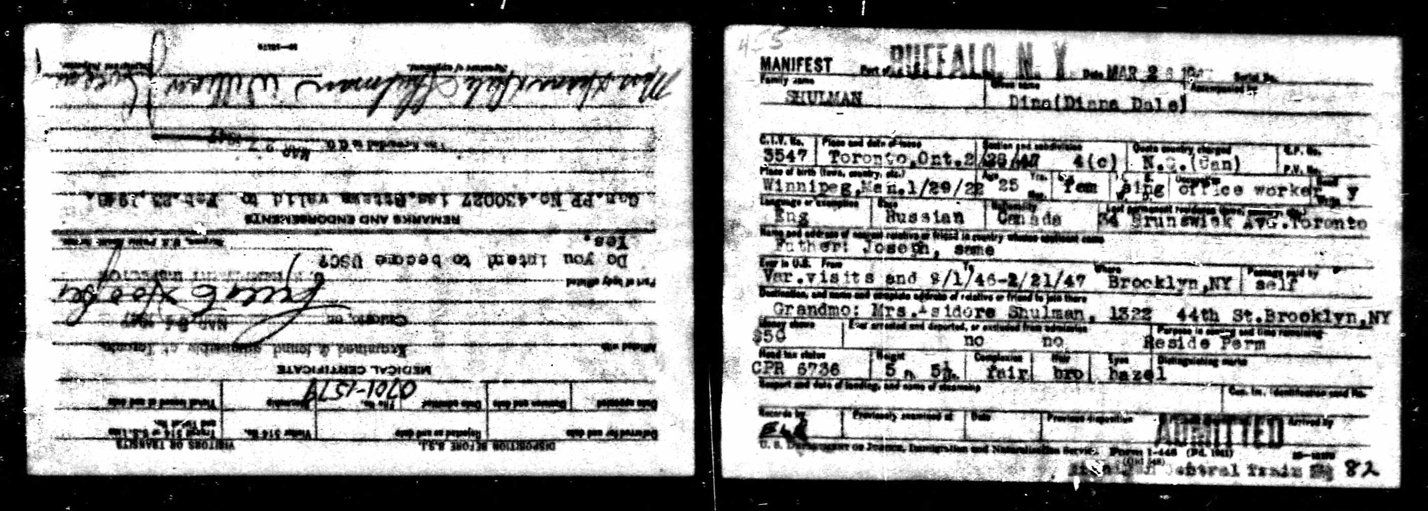 At one point, Diana seemed to be indicating at the border that she would live with her grandmother, Mrs. Isidore Shulman, who appeared to live with the Brands (one of Diana’s grandmother’s daughters) during the mid-forties.